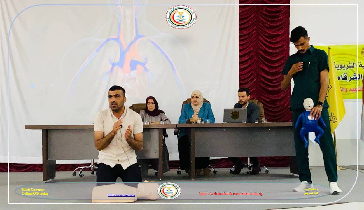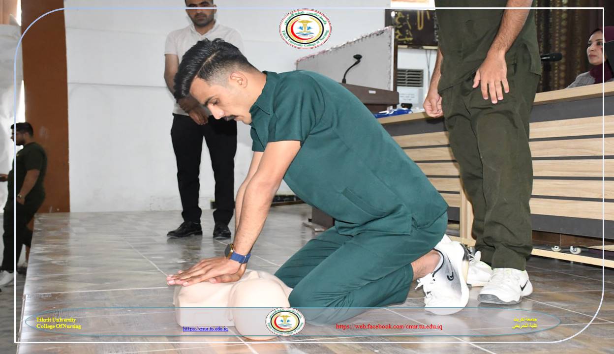 برعاية أ.م.د وعد محمود رؤوف رئيس جامعة تكريت المحترم وبإشراف وحضور أ.د عبدالرحمن جهاد منصور عميد كلية التمريض المحترم أ.م.د سياف عبد حسين مدير مركز التعليم المستمر المحترم، كما أقام المركز الافتراضي للمرأة المعاقة في كلية التمريض بالتعاون مع مركز التعليم المستمر في جامعة تكريت وهندسة العمليات النفطية دورة تدريبية حضورية للاسعافات الاولية تحت عنوان (الاسعافات الاولية كمشروع حياة )، حيث أُفتتحت الدورة بإلقاء كلمة علمية مفصلة عن الدورة والتي ألقتها على مسامع الحضور أ.م.د سرى سعد عبدالعزيز معاون العميد للشؤون العلمية واستهلت الدورة بإعطاء شرح تفصيلي عن الاسعافات الدولية من قبل م.د ناريمان احمد محمد إحدى اعضاء الهيئة التدريسية في الكلية، وتضمنت أهداف الدورة :