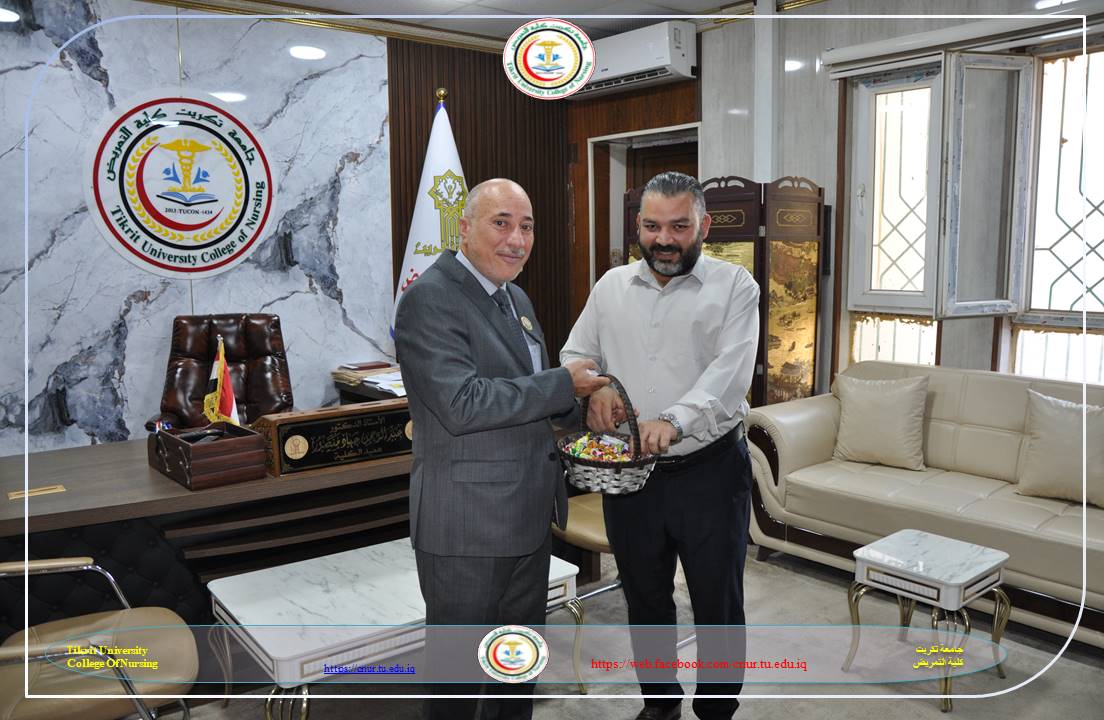 إستقبل السيد عميد الكلية الأستاذ الدكتور عبدالرحمن جهاد منصور في مكتبه صباح هذا اليوم الاحد الموافق ٢٠٢٤/٤/١٤ أساتذة وموظفي الكلية يتقدمهم الاستاذ المساعد الدكتور خلف نهر احمد المعاون الاداري ليقدموا له التهاني والتبريكات بمناسبة عيد الفطر المبارك متمنين له الصحة والسلامة والموفقية في عمله ومهامه في الكلية ومن جانبه وجه سيادته لهم أزكى التهاني والتبريكات بهذه المناسبة المباركة.