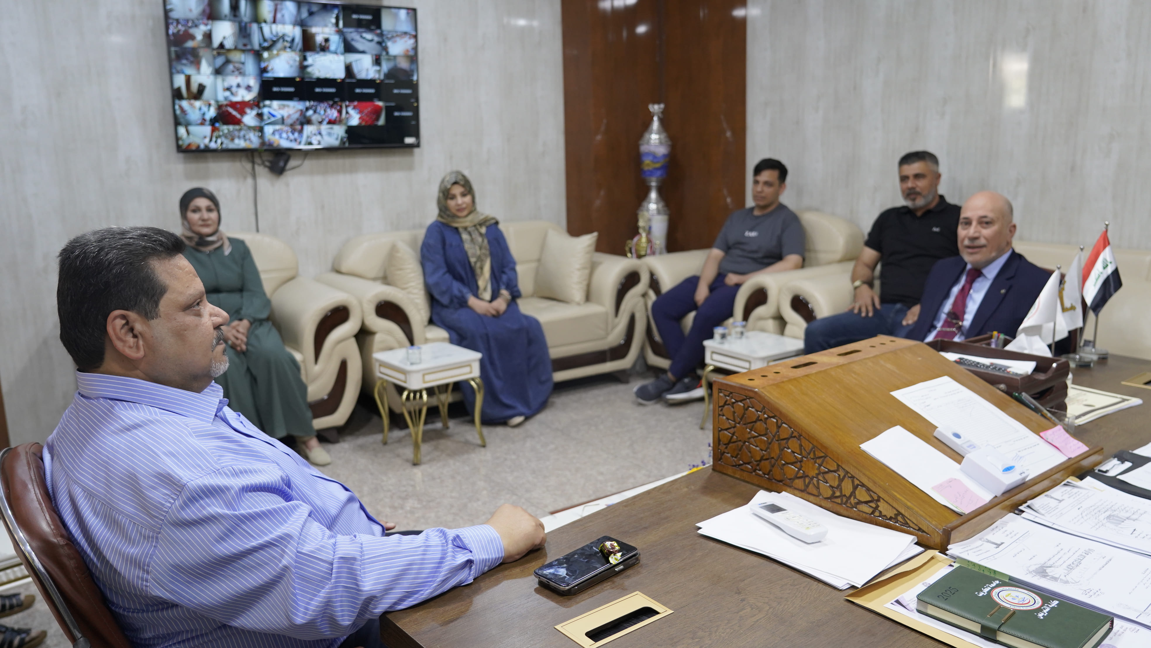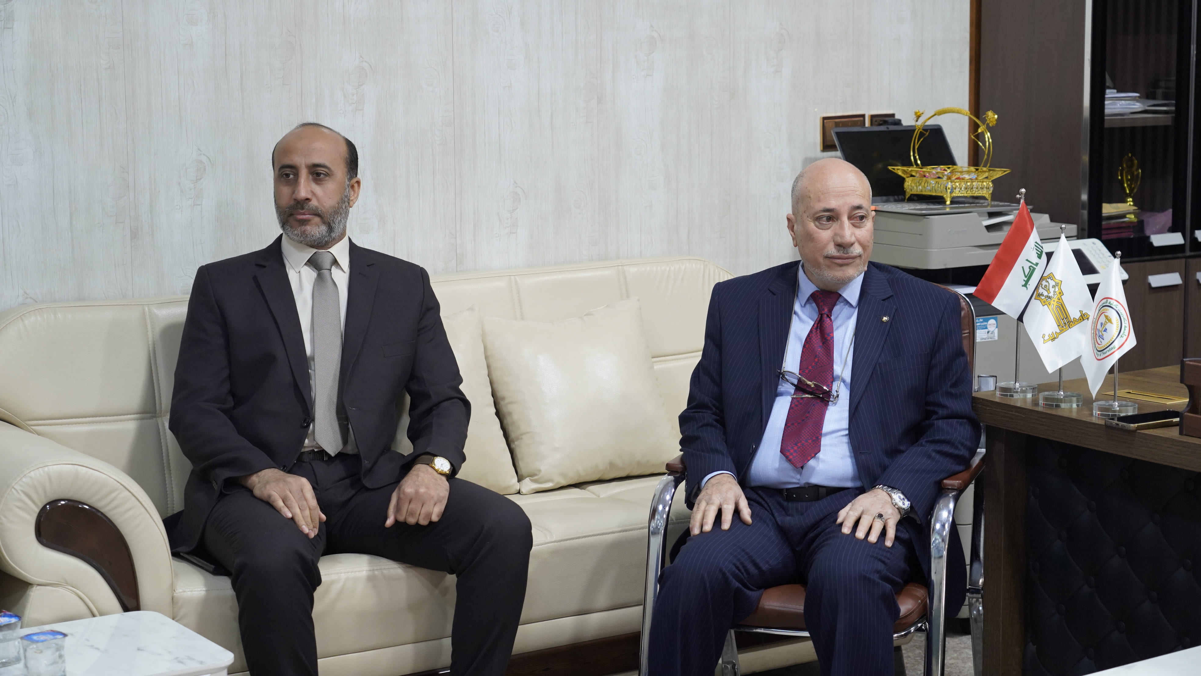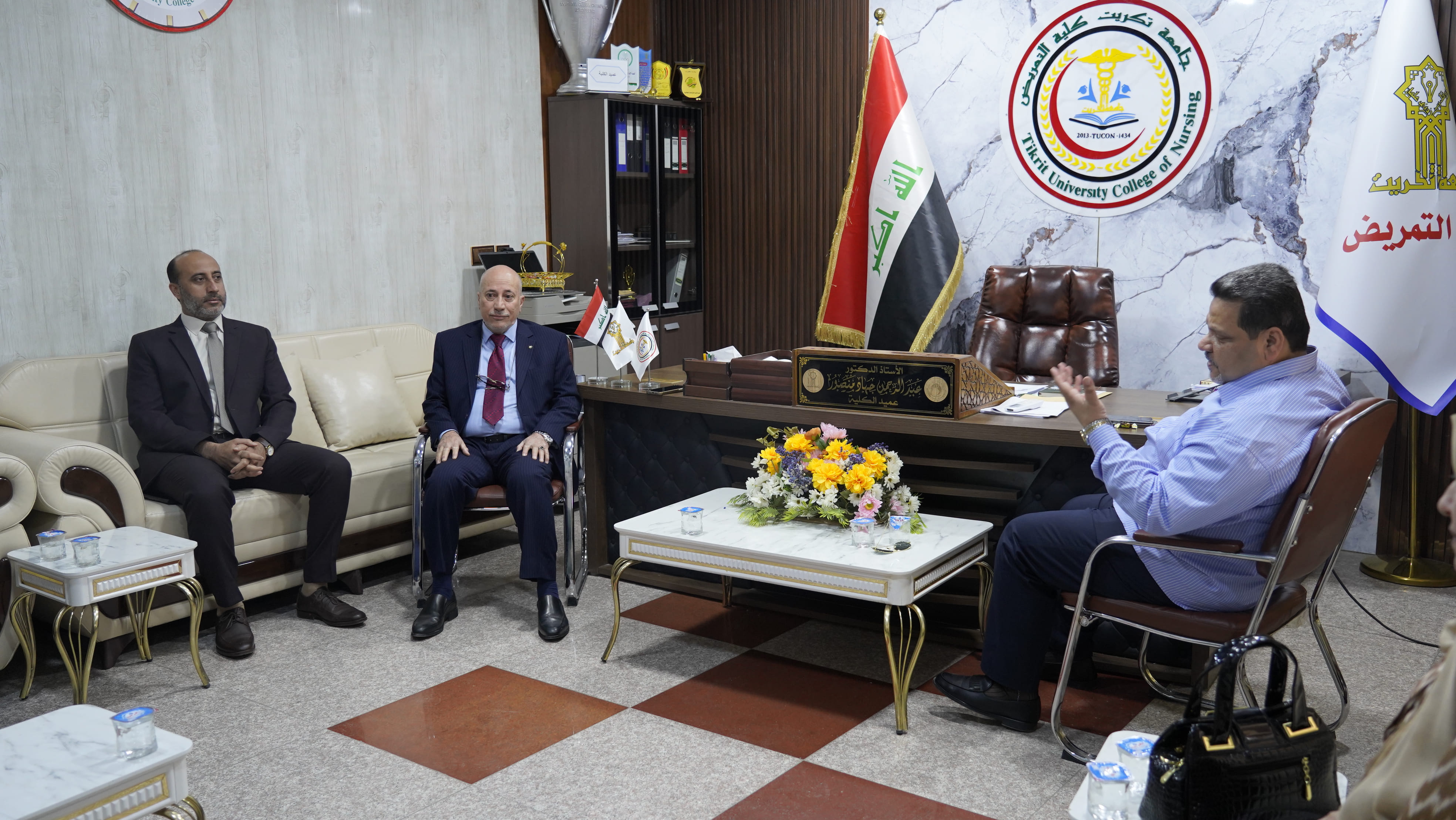 استقبل الاستاذ الدكتور عبدالرحمن جهاد منصور عميد كلية التمريض في مكتبه الاستاذ الدكتور حسين عبد اسماعيل مساعد رئيس الجامعة للشوؤن الادارية بحضور الاستاذ المساعد الدكتور خضر جاسم الفحل المعاون الاداري للعميد وعدد من السادة رؤساء الاقسام حيث تم التباحث في عدد من الشؤون الادارية والإلتزام بالضوابط والتعليمات والمواضيع الخاصة بسير العمل الاداري وتنظيمه بالكلية والوقوف على أهم الاحتياجات والمتطلبات وايجاد الحلول للمشاكل التي تعرقل سير العمل خدمة لجامعتنا العزيزة