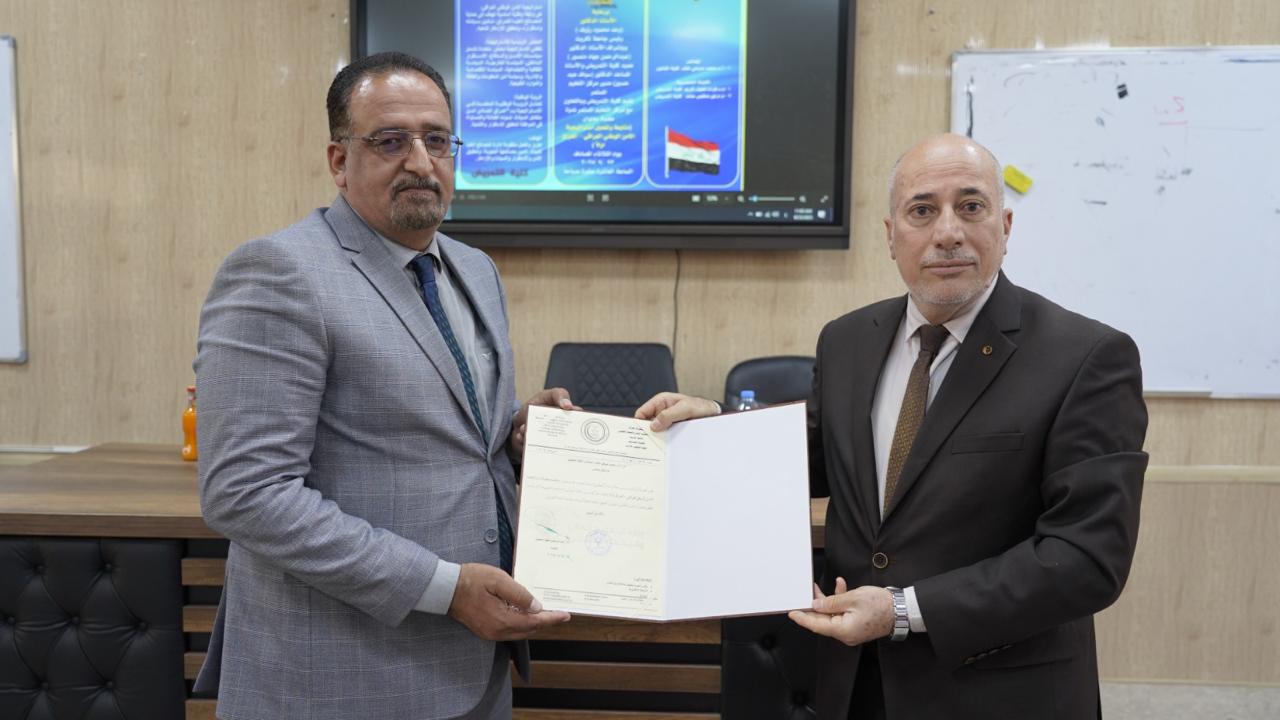 وفي ختام الندوة تم تقديم شهادة تقديرية للأستاذ الدكتور محمد صبحي خلف تثمينا لمشاركته العلمية القيمة بادارة محاور الندوة بحضور السيدين مديري قسم العلاقات الثقافية وقسم شؤون الطلبة