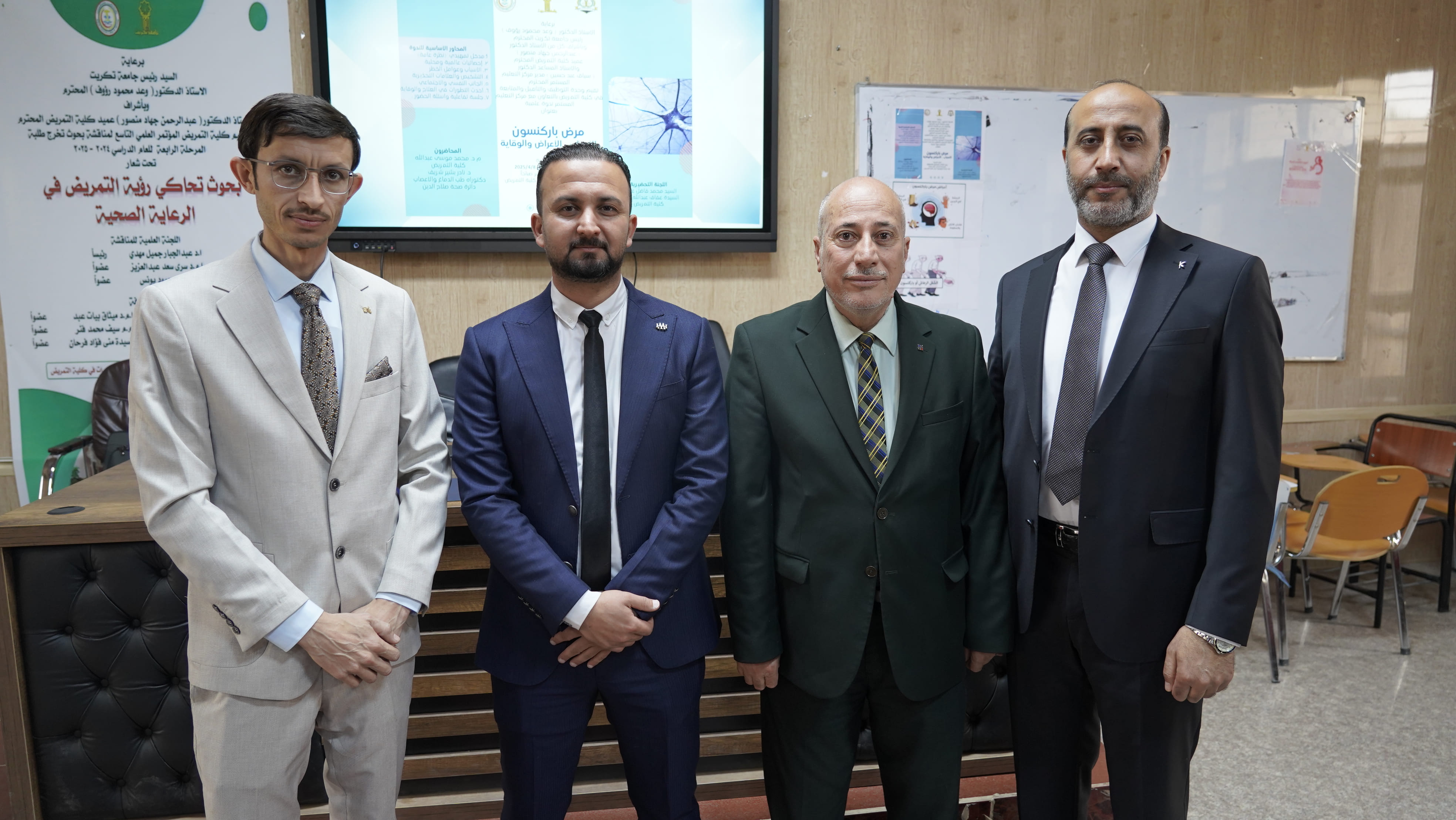 برعاية الاستاذ الدكتور ( وعد محمود رؤوف) رئيس جامعة تكريت وبأشراف كل من الاستاذ الدكتور (عبد الرحمن جهاد منصور) عميد كلية التمريض وبالتعاون مع الاستاذ المساعد الدكتور (سياف عبد حسين) مدير مركز التعليم المستمر في رئاسة الجامعة اقامت وحدة التوظيف والتأهيل والمتابعة في كلية التمريض بالتعاون مع مركز التعليم المستمر ندوة علمية تحت عنوان (مرض باركنسون الأسباب الأعراض والوقاية) احتضنت فعالياتها قاعة المؤتمرات في الكلية وهدفت الى التعريف بمرض باركنسون وانواعه وبيان اسبابه وتأثيراته وطرق الوقاية والعلاج منه وتناولت الندوة التي القى محاورها كل من السيد محمد فاضل عدوان والسيدة عفاف عبدالله يونس من كلية التمريض والمدرس الدكتور محمد موسى عبدالله كلية التمريض والدكتور نادر بشير شريف دكتوراه طب الدماغ والاعصاب من دائرة صحة صلاح الدين عدة محاور كان على رأسها مدخل تمهيدي (نظرة عامة) وإحصائيات عالمية ومحلية بالاضافة الى الأسباب وعوامل الخطر والتشخيص والعلامات التحذيرية فضلا الى الجانب النفسي والاجتماعي وأحدث التطورات في العلاج والوقاية واختتمت بجلسة تفاعلية واسئلة الحضور
