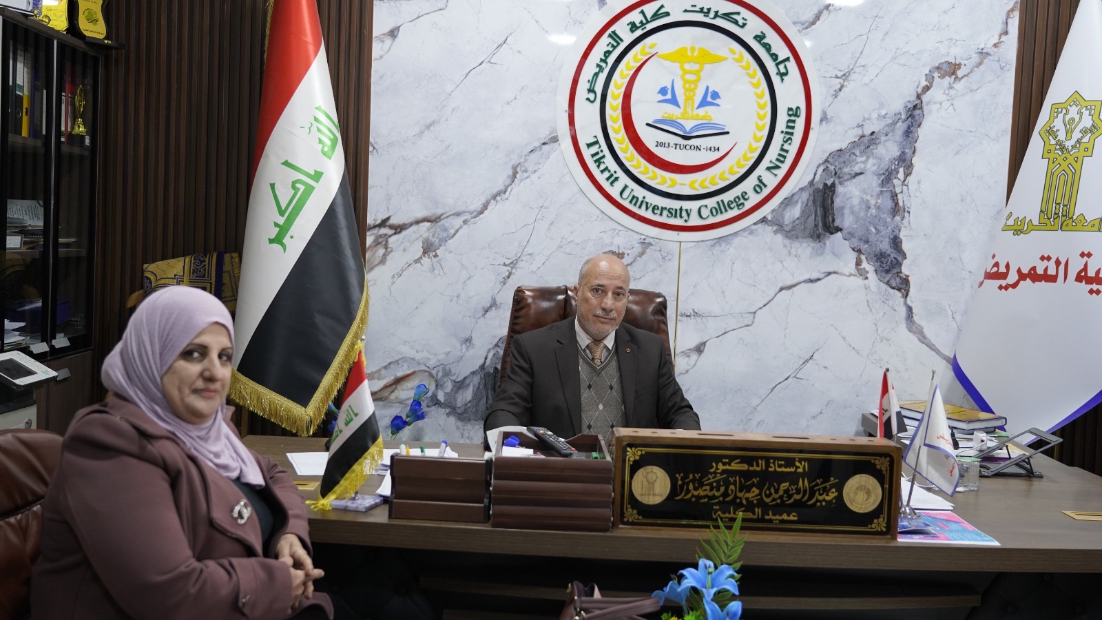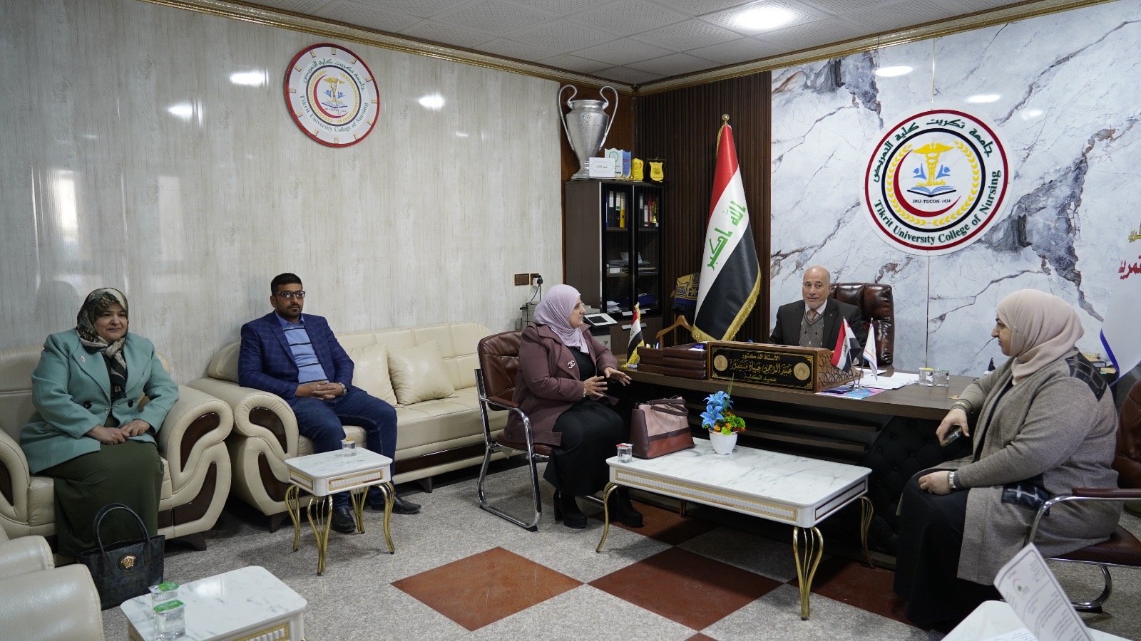 من منطلق التعاون المشترك بين مؤسسات الدولة استقبل السيد عميد كلية التمريض الاستاذ الدكتور عبدالرحمن جهاد منصور المحترم وفد من دائرة صحة صلاح الدين/قسم الصحة العامة ممثلة بالدكتورة انغام صلاح حسين -طبيب اختصاص -مديرة شعبة الصحة المدرسية والدكتورة احلام عمر وهيب مسؤولة شعبة السيطرة على العوز المناعي والسيد محمد بهجت يعقوب مسؤول شؤون الطلبة