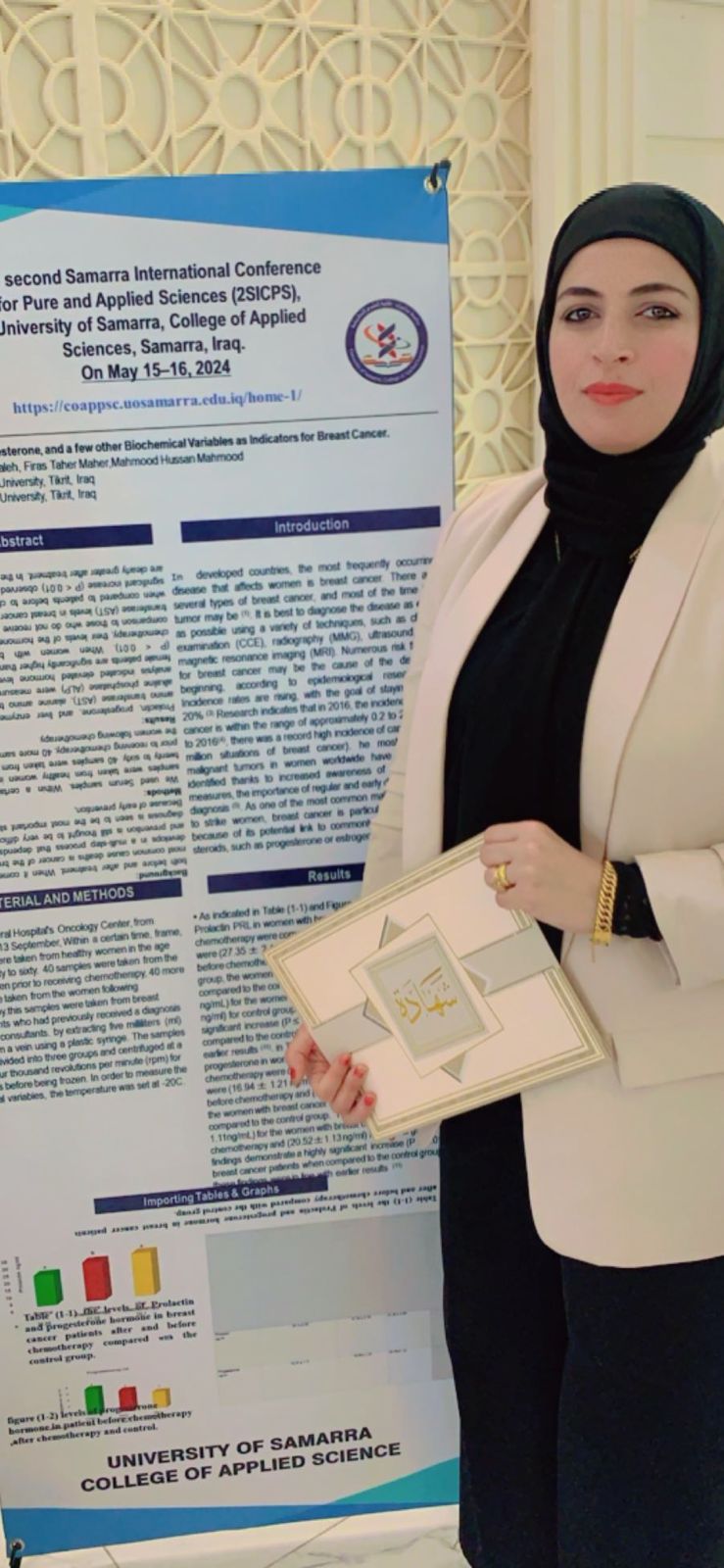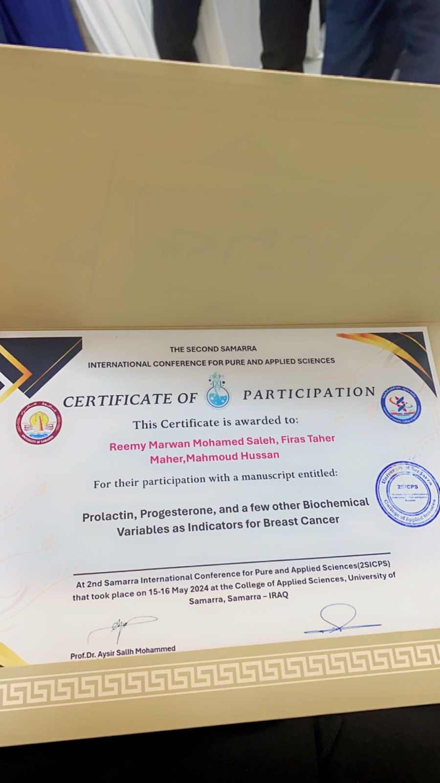 شارك كل من م.م ريمي مروان محمد صالح و م.م محمود حسن محمود اعضاء الهيئة التدريسية في كلية التمريض بجامعة تكريت بالمؤتمر الدولي الثاني للعلوم الصرفة والتطبيقية والذي اقيم في (جامعة سامراء) برعاية معالي وزير التعليم العالي والبحث العلمي الدكتور نعيم العبودي وبأشراف الاستاذ الدكتور صباح علاوي السامرائي رئيس جامعة سامراء وجاءت المشاركة عن البحث الموسوم (Prolactin, Progesterone, and a few other Biochemical Variables as Indicators for Breast cancer)