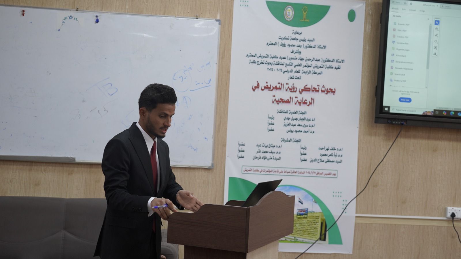 بحضور بحضور عميد كلية التمريض الاستاذ الدكتور عبد الرحمن جهاد منصور المحترم أقامت كلية التمريض المؤتمر العلمي التاسع لمناقشة مشاريع بحوث تخرج طلبة المرحلة الرابعة للعام الدراسي 2024-2025، تحت شعار (بحوث تحاكي رؤية التمريض في الرعاية الصحية).