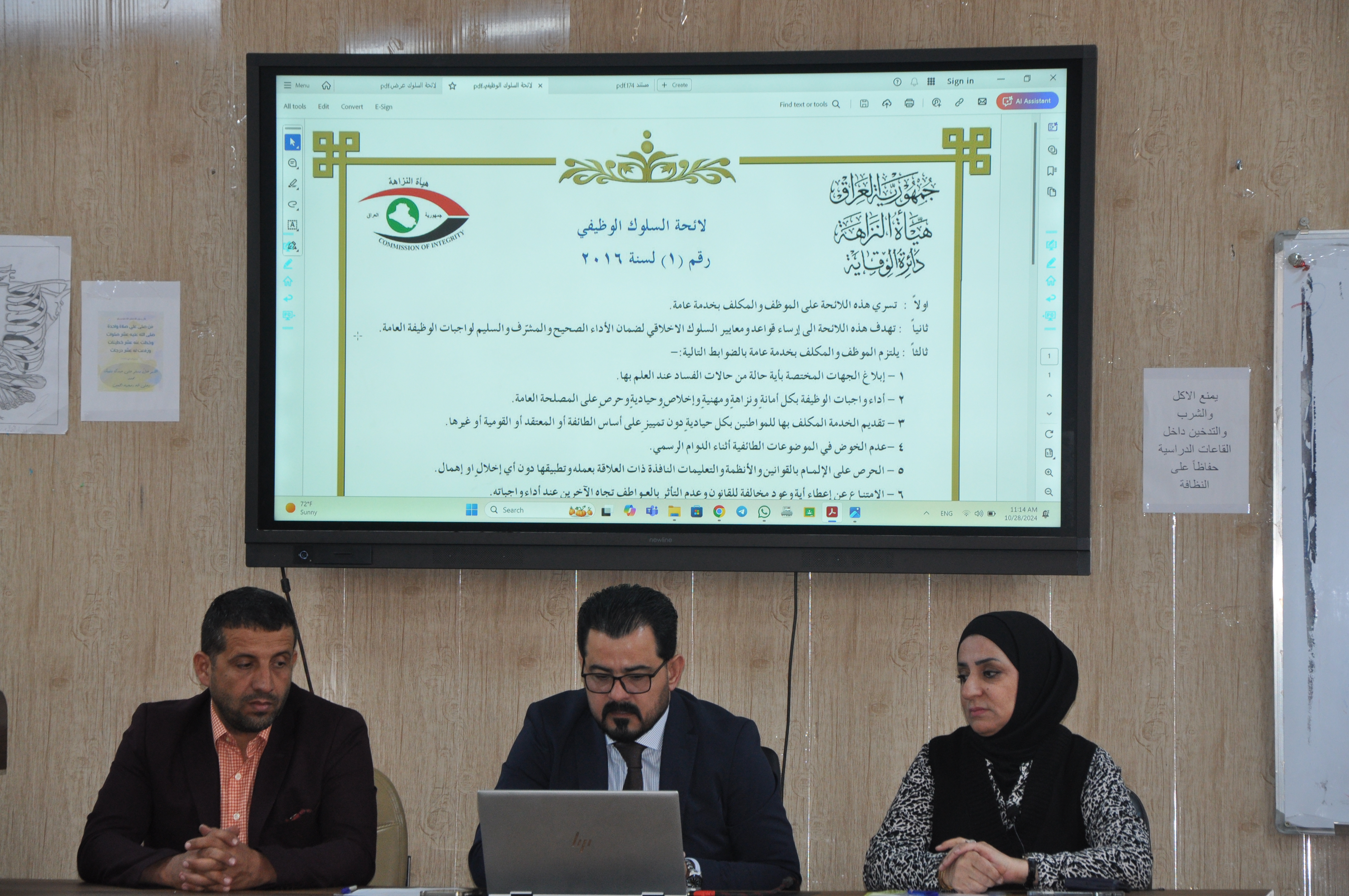 برعاية السيد رئيس جامعة تكريت أ.د وعد محمود رؤوف المحترم و بإشراف السيد عميد كلية التمريض أ.د عبد الرحمن جهاد منصور المحترم نظمت كلية التمريض وبالتعاون مع مركز التعليم المستمر ومركز المراة المعاقة وشعبة الشؤون الادارية/ كلية التمريض تنظم تنظم ندوة علمية حضورية بعنوان : لائحة السلوك الوظيفي رقم (1) لسنة 2016 وذلك يوم الاثنين الموافق 28/ 10/ 2024 في الساعة الحادية عشر صباحا في قاعة رقم 01 بكلية التمريض.