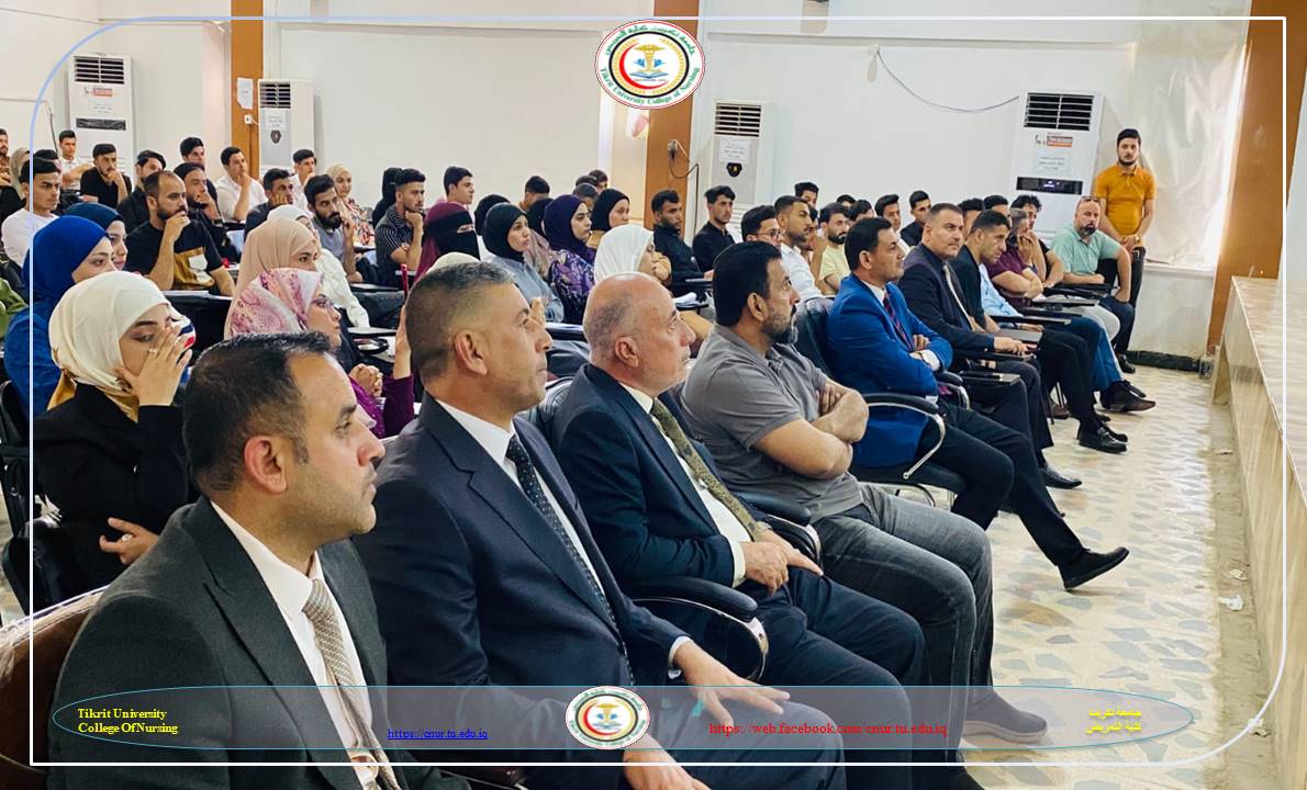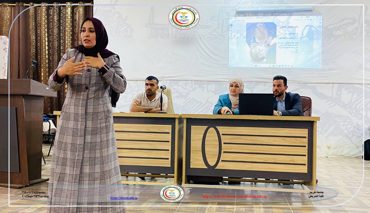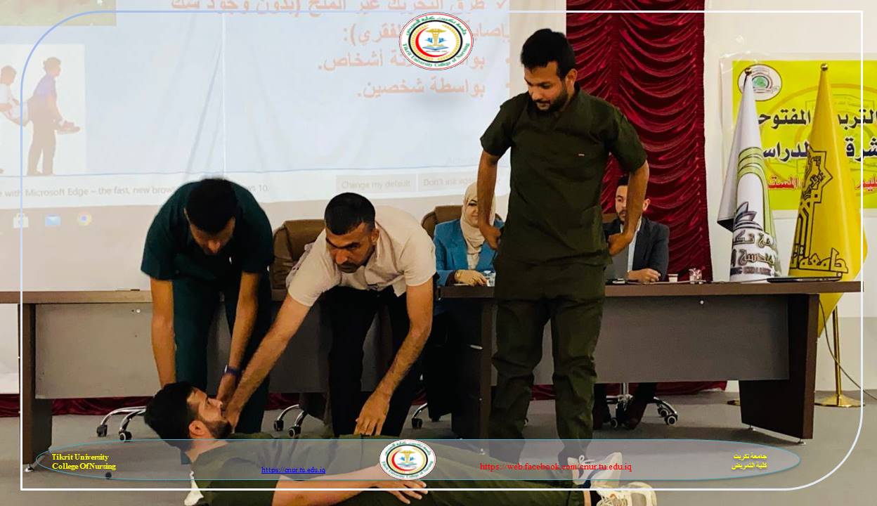 برعاية أ.م.د وعد محمود رؤوف رئيس جامعة تكريت المحترم وبإشراف وحضور أ.د عبدالرحمن جهاد منصور عميد كلية التمريض المحترم أ.م.د سياف عبد حسين مدير مركز التعليم المستمر المحترم، كما أقام المركز الافتراضي للمرأة المعاقة في كلية التمريض بالتعاون مع مركز التعليم المستمر في جامعة تكريت وهندسة العمليات النفطية دورة تدريبية حضورية للاسعافات الاولية تحت عنوان (الاسعافات الاولية كمشروع حياة )، حيث أُفتتحت الدورة بإلقاء كلمة علمية مفصلة عن الدورة والتي ألقتها على مسامع الحضور أ.م.د سرى سعد عبدالعزيز معاون العميد للشؤون العلمية واستهلت الدورة بإعطاء شرح تفصيلي عن الاسعافات الدولية من قبل م.د ناريمان احمد محمد إحدى اعضاء الهيئة التدريسية في الكلية، وتضمنت أهداف الدورة :