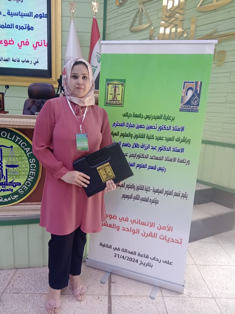 شاركت التدريسية المدرس المساعد الاء محمد حسن عن كلية التمريض جامعة تكريت في المؤتمر العلمي الدولي الثاني الموسوم الامن الانساني في ضوء تحديات القرن الحادي والعشرون والذي أقيم في رحاب جامعة ديالى كلية القانون والعلوم السياسية على قاعة العدالة يوم الأحد الموافق ٢٠٢٤/٤/٢١.