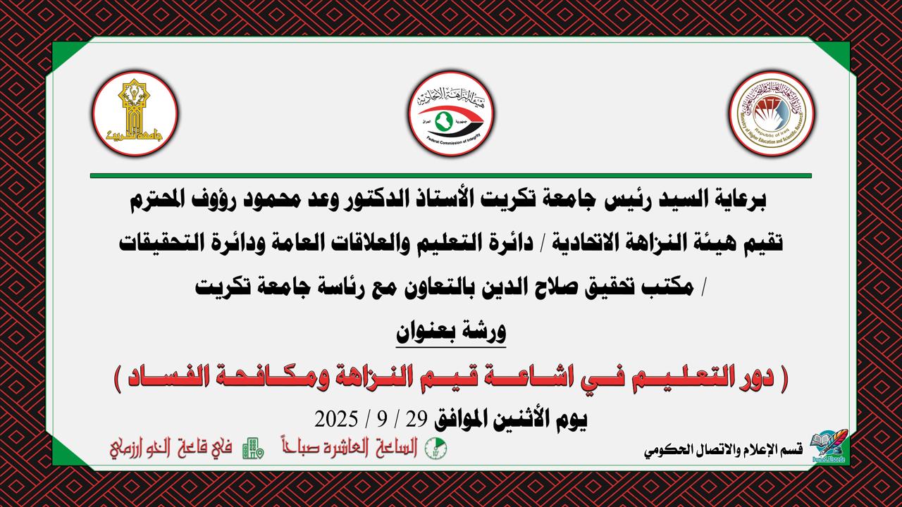 (التعليم في إشاعة قيم النزاهة ومكافحة الفساد) التي اقيمت برعاية الاستاذ الدكتور وعد محمود رؤوف رئيس جامعة تكريت يوم الاثنين الموافق 29 أيلول 2025 في قاعة الخوارزمي وبالتعاون بين هيئة النزاهة الاتحادية/ دائرة التعليم والعلاقات العامة ودائرة التحقيقات/ مكتب تحقيق صلاح الدين ورئاسة جامعة تكريت