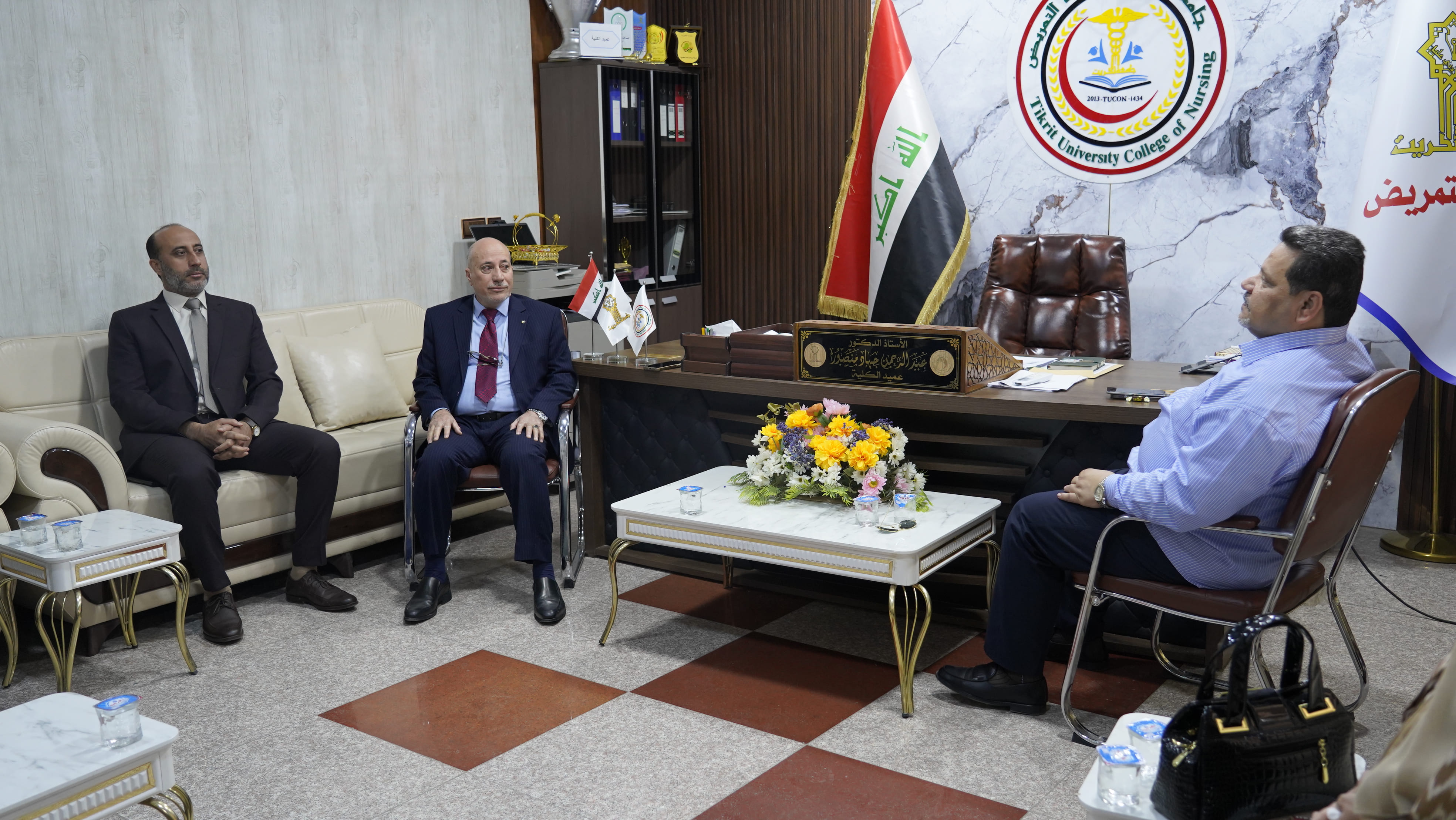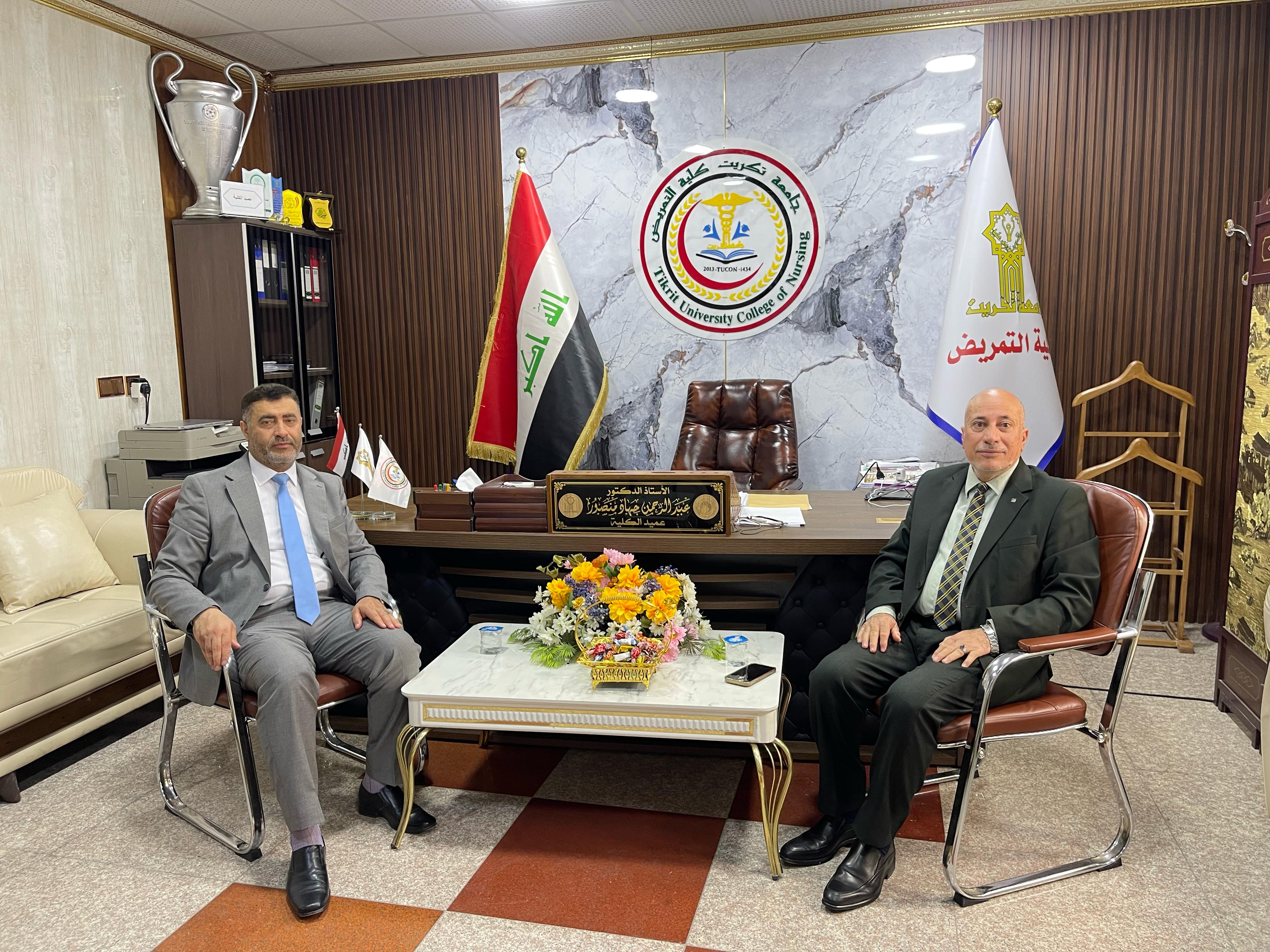 استقبل الاستاذ الدكتور عبدالرحمن جهاد منصور عميد كلية التمريض في مكتبه الاستاذ الدكتور حسين عبد اسماعيل مساعد رئيس الجامعة للشوؤن الادارية بحضور الاستاذ المساعد الدكتور خضر جاسم الفحل المعاون الاداري للعميد وعدد من السادة رؤساء الاقسام حيث تم التباحث في عدد من الشؤون الادارية والإلتزام بالضوابط والتعليمات والمواضيع الخاصة بسير العمل الاداري وتنظيمه بالكلية والوقوف على أهم الاحتياجات والمتطلبات وايجاد الحلول للمشاكل التي تعرقل سير العمل خدمة لجامعتنا العزيزة