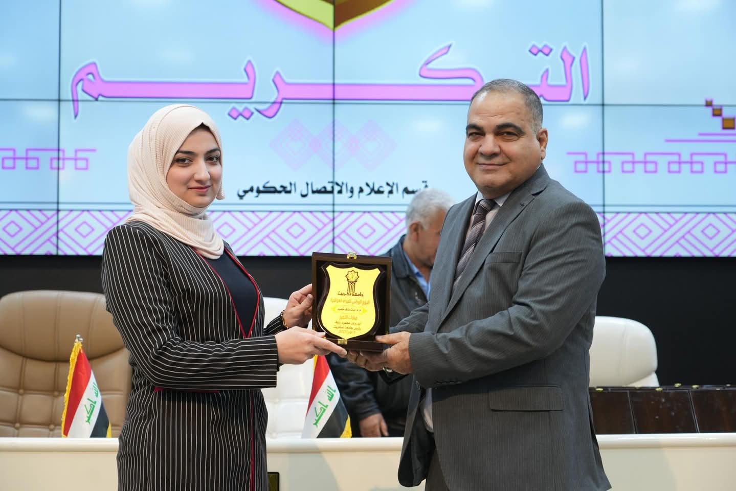 برعاية الاستاذ الدكتور وعد محمود رؤوف رئيس جامعة تكريت وحضور الاستاذ الدكتور حسن حسين ابراهيم مساعد رئيس الجامعة للشؤون العلمية ممثلا عن رئيس الجامعة واسهاما منها في تعزيز دور المرأة في المجتمع واحتفاء بمناسبة يوم المرأة العراقي الذي يوافق ٣/ ٣/ ٢٠٢٥ وتحت شعار (اذا اعددتها) نظمت جامعة تكريت احتفالية على رحاب قاعة الخوارزمي بحضور عدد من السادة عمداء الكليات وعدد من تدريسيات وموظفات وطالبات الجامعة.. وتم تكريم كوكبة من التدريسيات وموظفات الجامعة المتميزات تثمينا لدورهم وتقديرا لجهودهم في خدمة الجامعة والمجتمع.. وكان لكلية التمريض جزء منها اذ تم تكريم كل من مسؤولة شعبة ضمان الجودة م.م. ايات مناف حميد و مسؤولة شعبة المكتبة السيدة زهراء خالد صبحي.