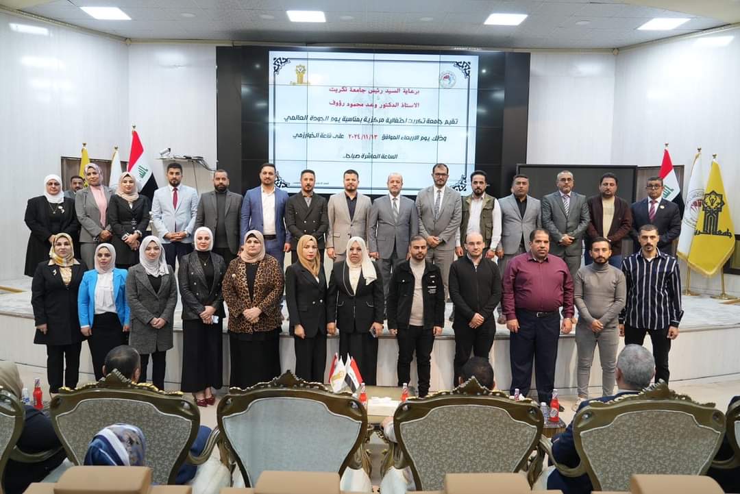 حيث افتتحت فعالية الاحتفال بالنشيد الوطني ونشيد الجامعة، ثم كلمة رئيس جامعة تكريت المحترم الاستاذ الدكتور وعد محمود رؤوف اثنى فيها على الجهود الكبيرة التي تبذل لتطبيق معايير الجودة في الجامعة واكد على اهمية السعي للدخول الى التصنيفات العالمية والحصول على الاعتمادية للارتقاء بالعملية التعليمية، مشيرا الى اهمية الاحتفاء بيوم الجودة كونها الركيزة الاساسية لتنمية المجتمع في كافة المجالات وخصوصا العملية التعليمية. مبينا على ان جامعة تكريت قد حققت مراكز متقدمة في (التصنيف العالمي التايمز)، وان هدف جامعة تكريت هو السعي الى دخول جميع كلياتها واقسامها ضمن التصنيفات العالمية التي تخص الجودة.