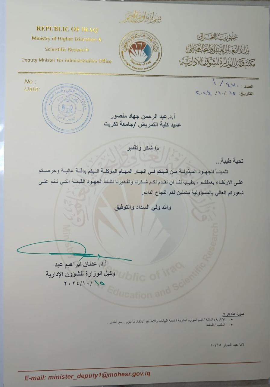 حصل الاستاذ الدكتور عبدالرحمن جهاد منصور عميد كلية التمريض بجامعة تكريت على كتاب شكر وتقدير من قبل وكيل وزارة التعليم العالي والبحث العلمي أ.د عدنان ابراهيم عبد تثميناً لجهوده المبذولة في انجاز المهام الموكلة اليه وحرصه على الارتقاء بالمستوى العلمي والعملي متمنياً له التوفيق والنجاح الدائم.