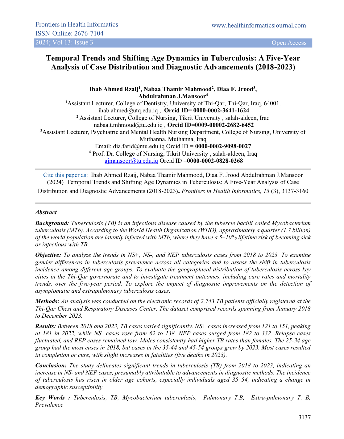نشر الاستاذ الدكتور عبد الرحمن جهاد منصور عميد كلية التمريض والتدريسية نبأ ثامر محمود بحثاً علمياً بعنوان (Temporal Trends and Shifting Age Dynamics in Tuberculosis: A Five-Year Analysis of Case Distribution and Diagnostic Advancements (2018-2023)) ضمن مستوعبات سكوبس العالمية