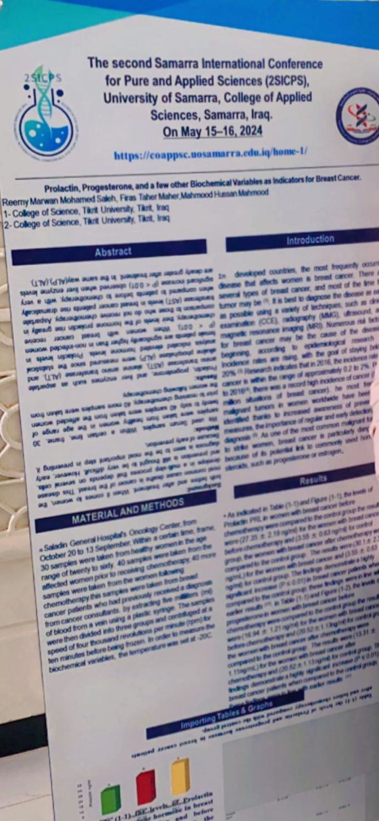 شارك كل من م.م ريمي مروان محمد صالح و م.م محمود حسن محمود اعضاء الهيئة التدريسية في كلية التمريض بجامعة تكريت بالمؤتمر الدولي الثاني للعلوم الصرفة والتطبيقية والذي اقيم في (جامعة سامراء) برعاية معالي وزير التعليم العالي والبحث العلمي الدكتور نعيم العبودي وبأشراف الاستاذ الدكتور صباح علاوي السامرائي رئيس جامعة سامراء وجاءت المشاركة عن البحث الموسوم (Prolactin, Progesterone, and a few other Biochemical Variables as Indicators for Breast cancer)