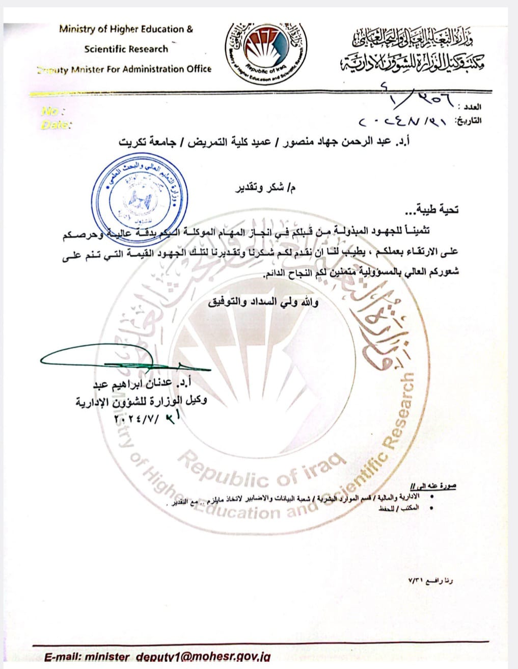 لجهوده المبذولة في المهام الموكلة إليه وشعوره العالي بالمسؤولية وكيل الوزارة يوجه بكتاب شكر وتقدير للأستاذ الدكتور عبد الرحمن جهاد منصور عميد كلية التمريض