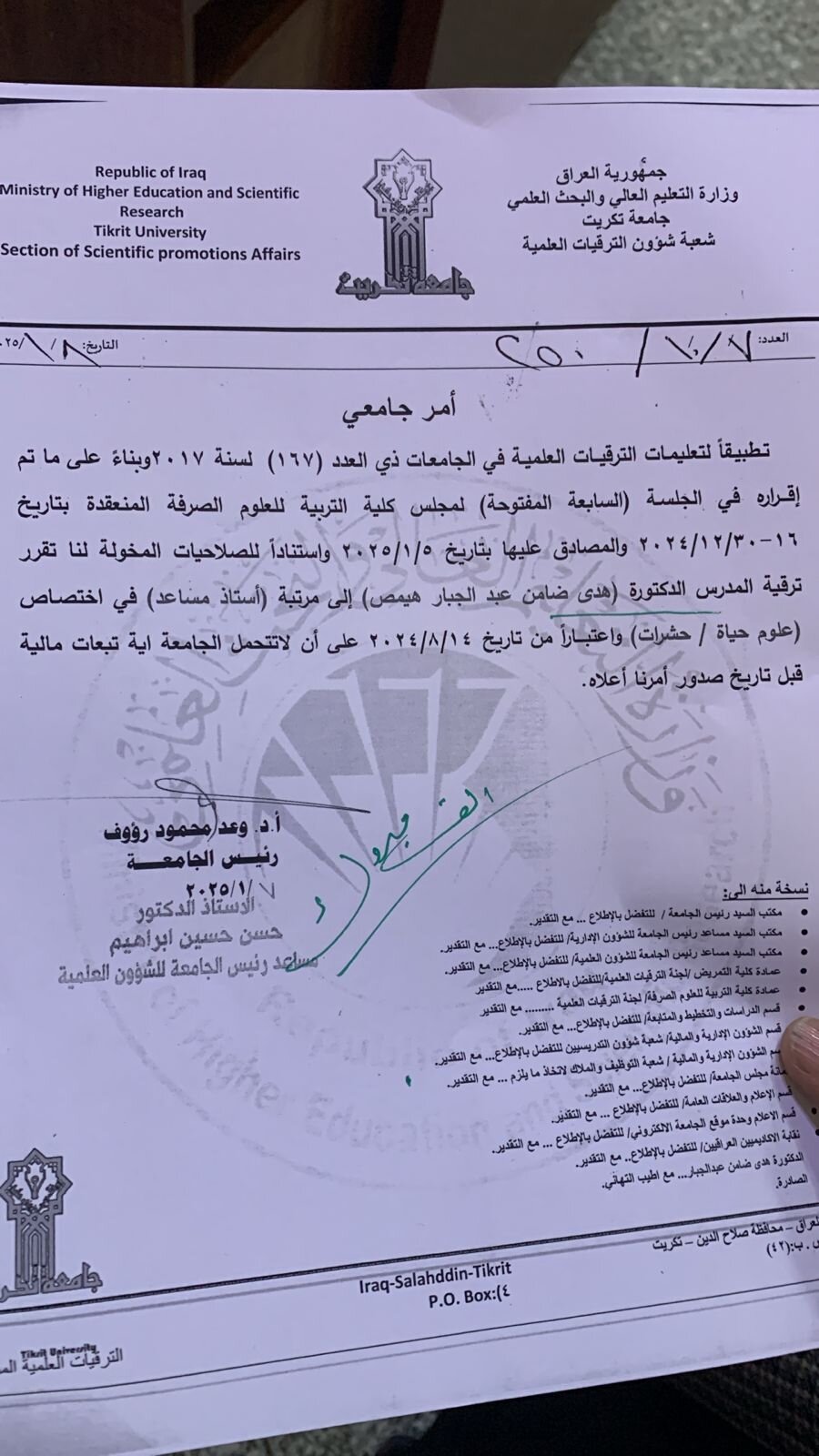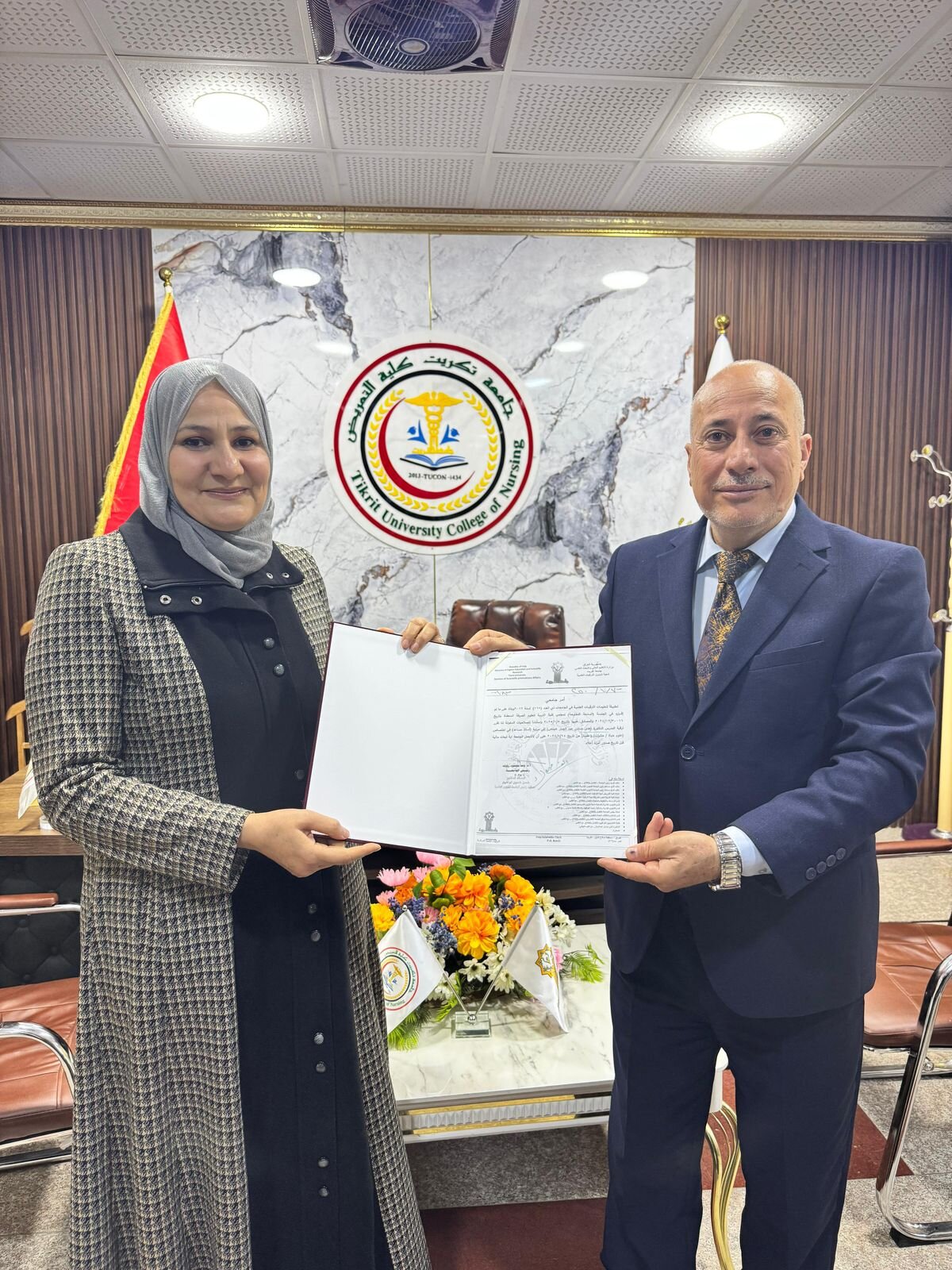 تتقدم عمادة كلية التمريض ممثلة بالأستاذ الدكتور (عبد الرحمن جهاد منصور) بأجمل التهاني والتبريكات للدكتورة (هدى ضامن عبد الجبار) التدريسية في التمريض بجامعة تكريت وذلك لترقيتها العلمية من مرتبة (مدرس) إلى مرتبة (أستاذ مساعد) حسب الأمر الجامعي، مبارك لها هذا الإنجاز العلمي الكبير.