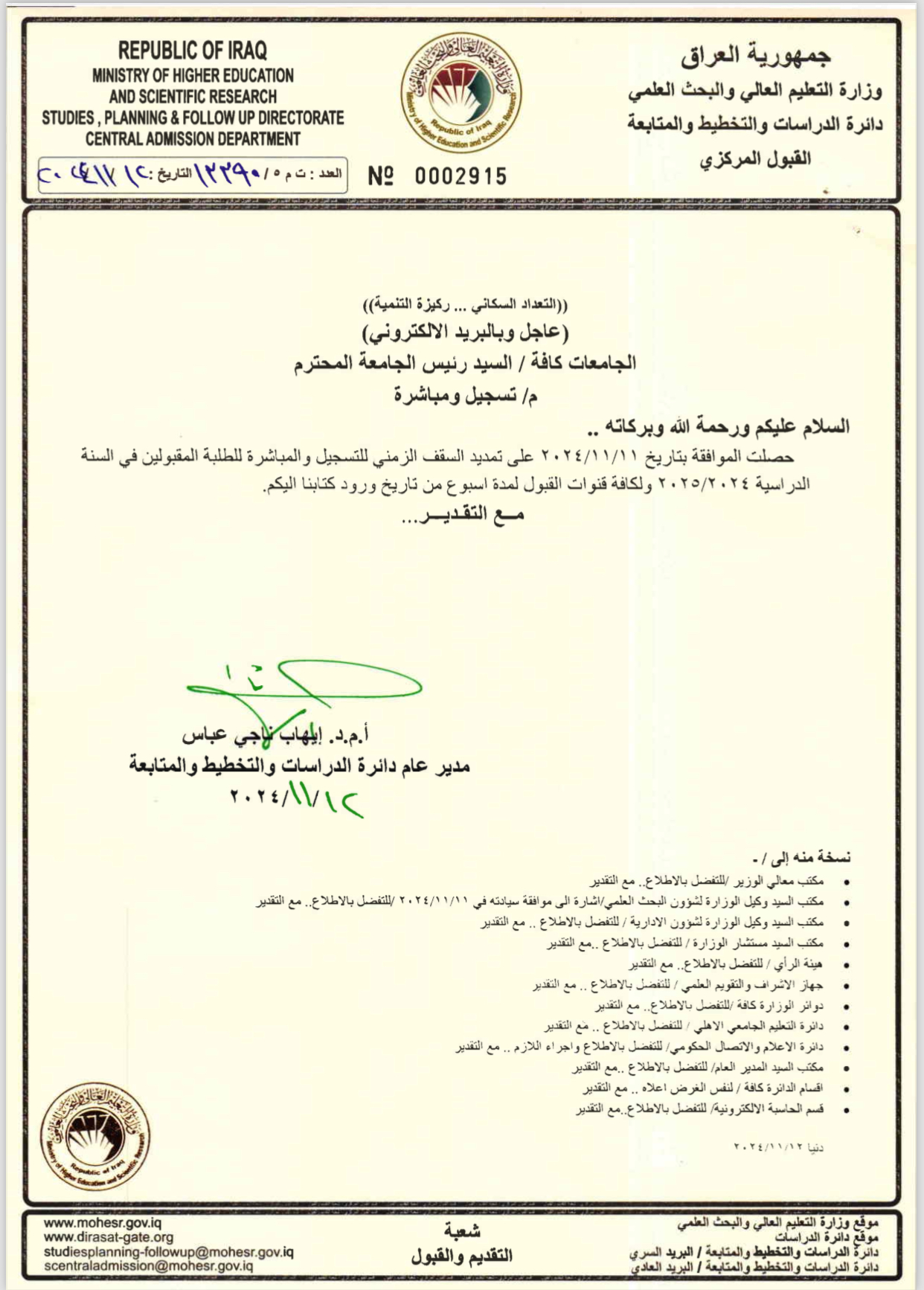 حصلت موافقة وزير التعليم العالي والبحث العلمي على تمديد السقف الزمني للتسجيل والمباشرة للطلبة المقبولين للعام الدراسي 2024-2025 ولكافة القنوات لمدة اسبوع ابتداء من تاريخ 12/11/2024 وحسب ما مبين في كتاب دائرة الدراسات والتخطيط والمتابعة المرفق اعلاه: