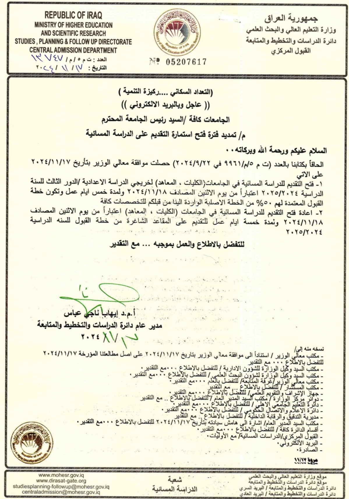 أعلنت وزارة التعليم العالي والبحث العلمي العراقية، دائرة الدراسات والتخطيط والمتابعة، عن تمديد فترة فتح استمارة التقديم على الدراسة المسائية لخريجي الكليات والمعاهد الإعدادية، للمقاعد الشاغره في الكليات