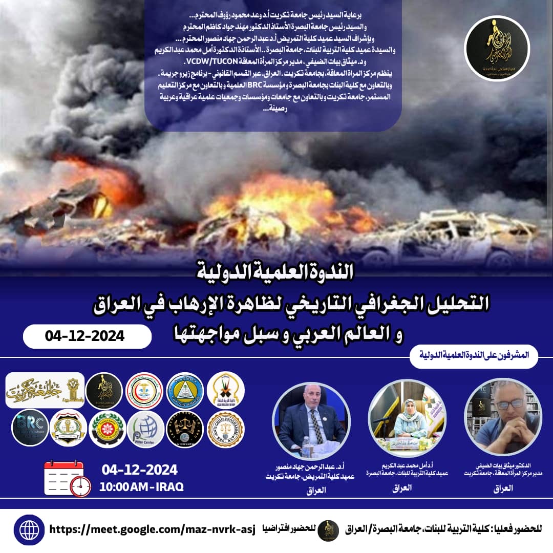 برعاية السيد رئيس جامعة تكريت أ.د وعد محمود رؤوف المحترم والسيد رئيس جامعة البصرة أ.د مهند جواد كاظم المحترم وبإشراف السيد عميد كلية التمريض أ.د عبدالرحمن جهاد منصور المحترم والسيد عميد كلية التربية للبنات أ.د أمل محمد عبدالكريم المحترم ومدير مركز المرأة المعاقة د. ميثاق بيات الضيفي وفي عالم يعاني من تحديات جسيمة على الصعيدين الأمني والسياسي، تبرز الحاجة الملحة لفهم أعمق للظواهر التي تهدد استقرارنا. ينظم مركز المرأة المعاقة في جامعة تكريت وبالتعاون مع كلية البنات بجامعة البصرة ومؤسسة BRC العلمية وبالتعاون مع مركز التعليم المستمر جامعة تكريت وكذلك مع مؤسسات وجامعات علمية عراقية وعربية رصينة.