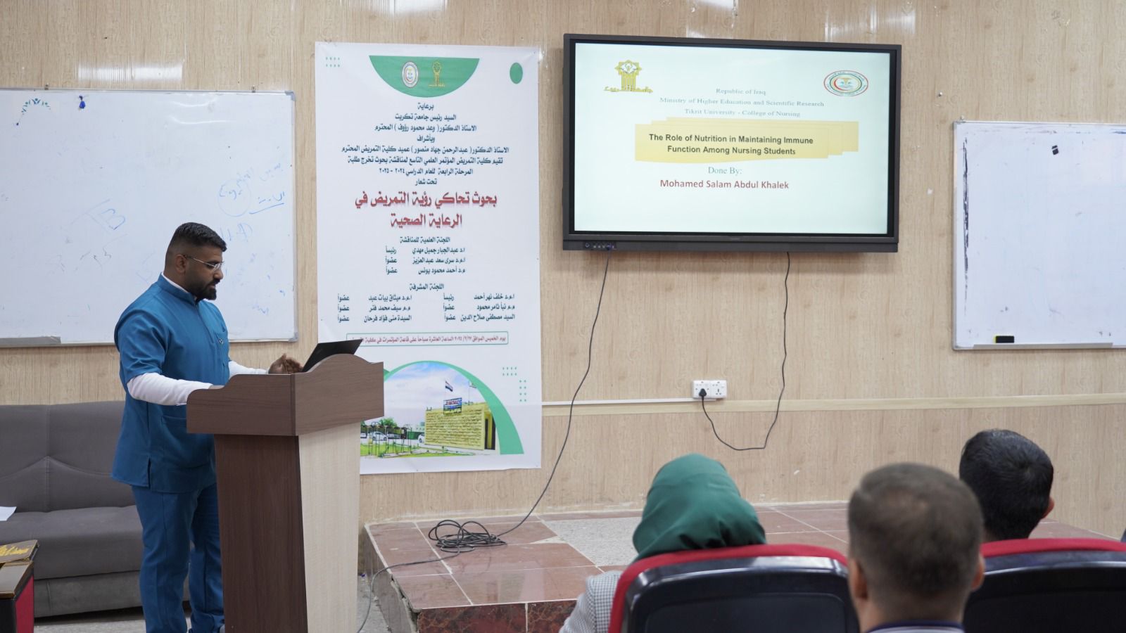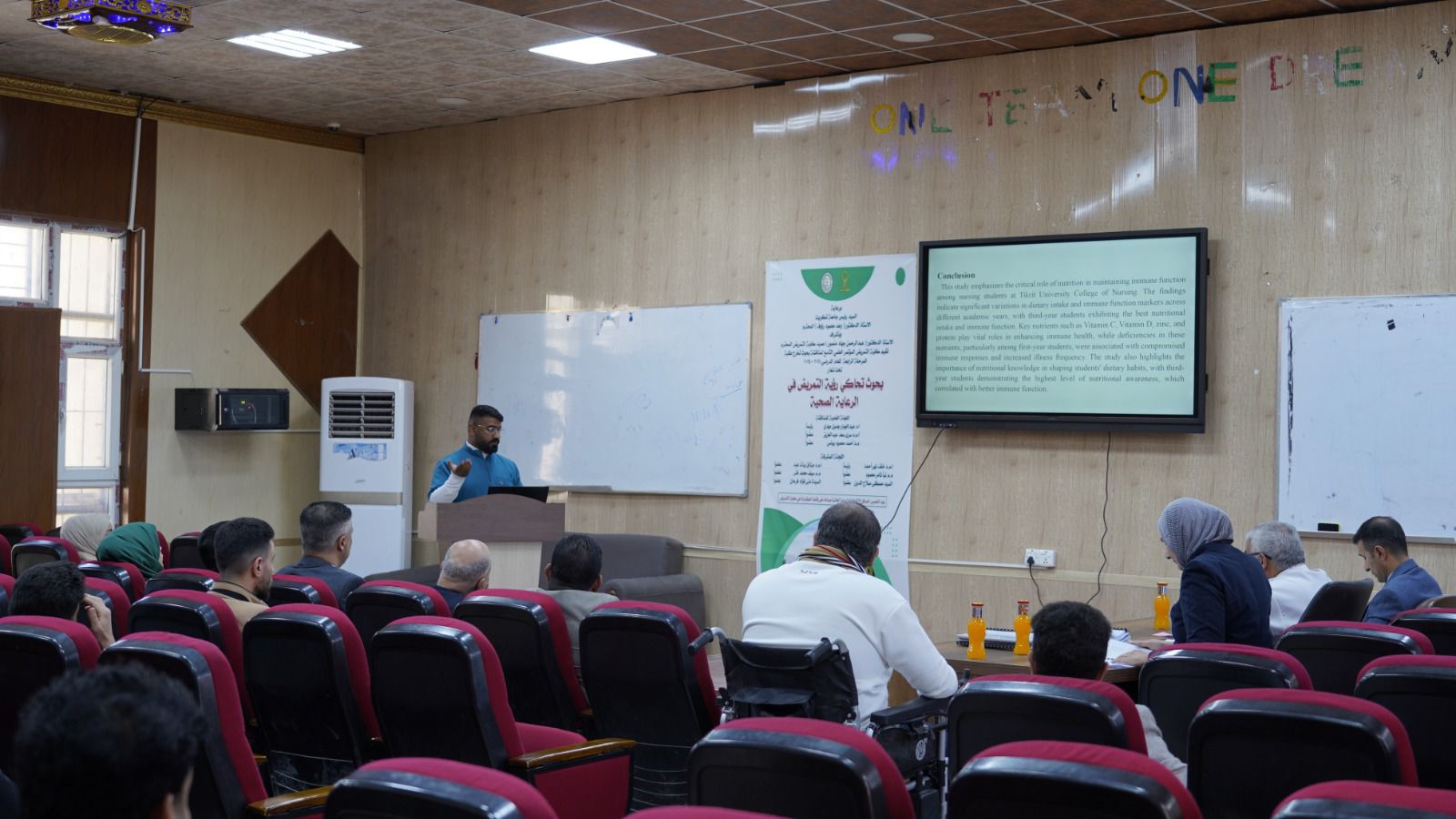 بحضور بحضور عميد كلية التمريض الاستاذ الدكتور عبد الرحمن جهاد منصور المحترم أقامت كلية التمريض المؤتمر العلمي التاسع لمناقشة مشاريع بحوث تخرج طلبة المرحلة الرابعة للعام الدراسي 2024-2025، تحت شعار (بحوث تحاكي رؤية التمريض في الرعاية الصحية).